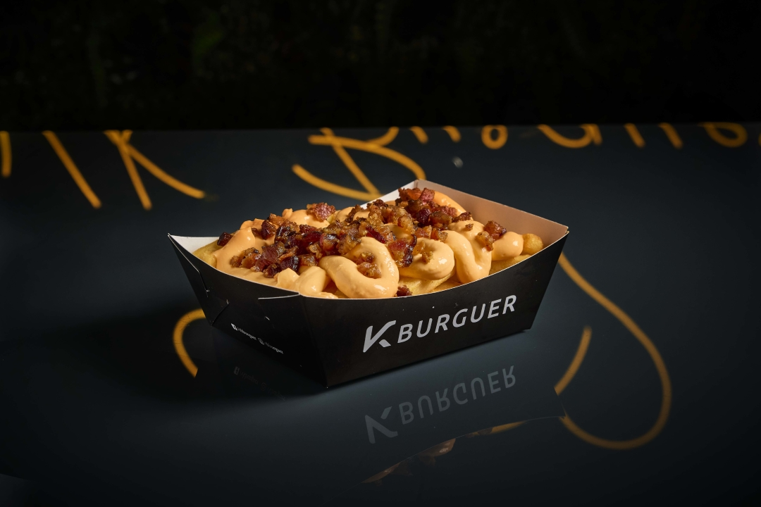 Batata frita 250g, coberta com molho cheddar e bacon em cubos.