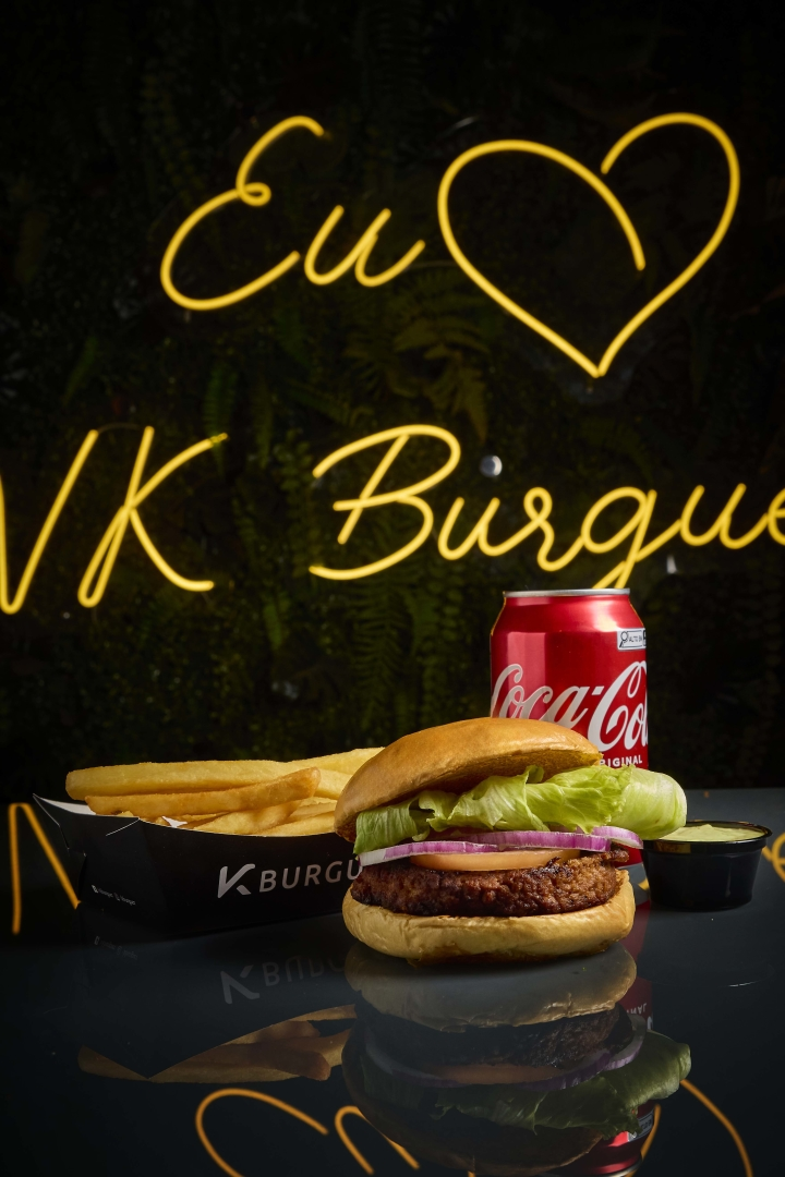 Pão, hambúrguer vegano mistura exclusiva de proteína tripla de soja, ervilha e grão-de-bico: completa e com a textura irresistível, tomate, cebola roxa e alface americano.